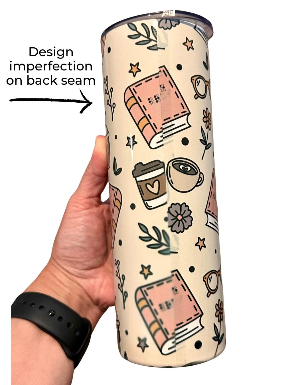Tumbler with funny ingredients label and cute braille books background. This tumbler is deeply discounted because there is a design flaw on the back. See 2nd picture.